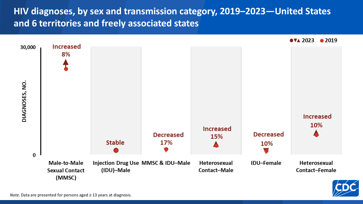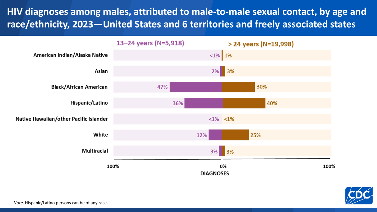 Efforts need to center gay men of color to address disparities. In 2023, over 39,000 people were diagnosed with HIV in the U.S.. Over 80% were men, with 66% attributed to male-to-male sexual contact. From 2019 to 2023, there was an 8% increase in new HIV acquisitions through male-to-male sexual contact.